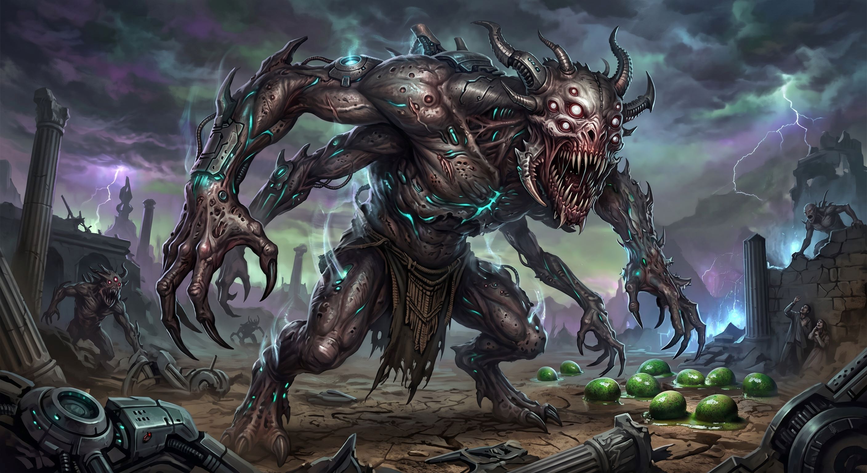 - Gesicht: Ein Albtraum aus mehreren Augen (oft rot leuchtend oder milchig weiß) und einem Maul voller nadelspitzer, unregelmäßiger Zähne. Sein Atem riecht nach Ozon, Verwesung und altem Moschus.